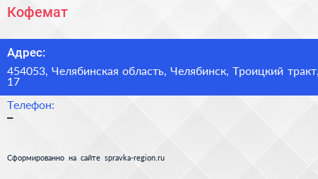 Кофемат по адресу 454053, Челябинская область, Челябинск, Троицкий тракт, 17 в дальнейшем Организация, размещена в следующих категориях: