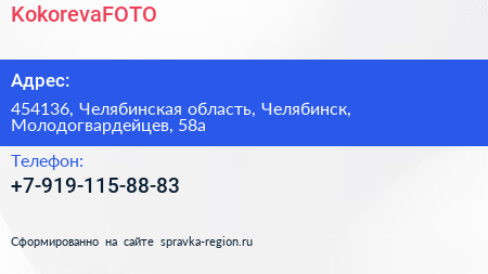KokorevaFOTO по адресу 454136, Челябинская область, Челябинск, Молодогвардейцев, 58а в дальнейшем Организация, размещена в следующих категориях: