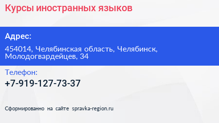 Курсы иностранных языков по адресу 454014, Челябинская область, Челябинск, Молодогвардейцев, 34 в дальнейшем Организация, размещена в следующих категориях: