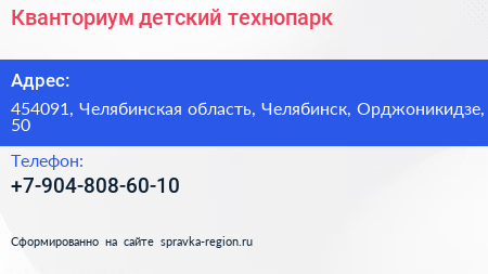 Кванториум, детский технопарк по адресу 454091, Челябинская область, Челябинск, Орджоникидзе, 50 в дальнейшем Организация, размещена в следующих категориях: