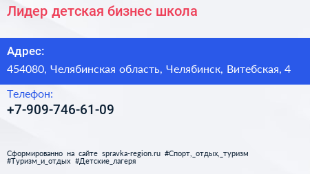 Лидер, детская бизнес-школа по адресу 454080, Челябинская область, Челябинск, Витебская, 4 в дальнейшем Организация, размещена в следующих категориях: