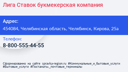 Лига Ставок, букмекерская компания по адресу 454084, Челябинская область, Челябинск, Кирова, 25а в дальнейшем Организация, размещена в следующих категориях: