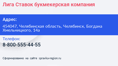 Лига Ставок, букмекерская компания по адресу 454047, Челябинская область, Челябинск, Богдана Хмельницкого, 14а в дальнейшем Организация, размещена в следующих категориях: