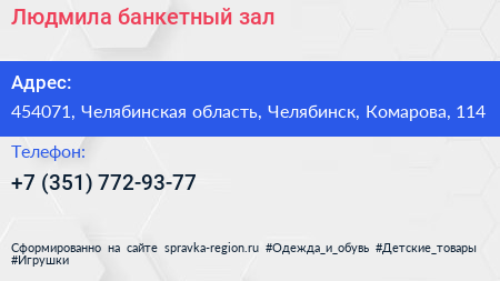 Людмила, банкетный зал по адресу 454071, Челябинская область, Челябинск, Комарова, 114 в дальнейшем Организация, размещена в следующих категориях: