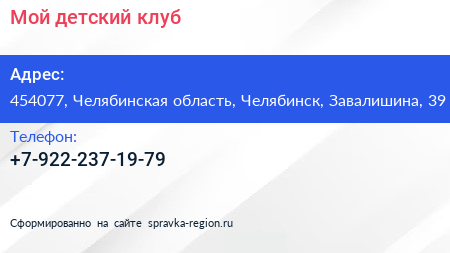 Мой детский клуб по адресу 454077, Челябинская область, Челябинск, Завалишина, 39 в дальнейшем Организация, размещена в следующих категориях: