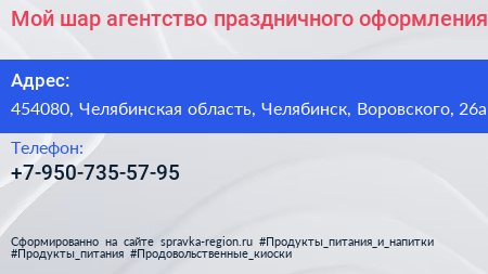 Мой шар, агентство праздничного оформления по адресу 454080, Челябинская область, Челябинск, Воровского, 26а в дальнейшем Организация, размещена в следующих категориях: