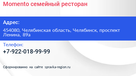 Momento, семейный ресторан по адресу 454080, Челябинская область, Челябинск, проспект Ленина, 89а в дальнейшем Организация, размещена в следующих категориях: