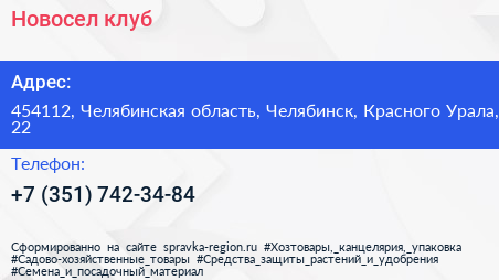 Новосел, клуб по адресу 454112, Челябинская область, Челябинск, Красного Урала, 22 в дальнейшем Организация, размещена в следующих категориях: