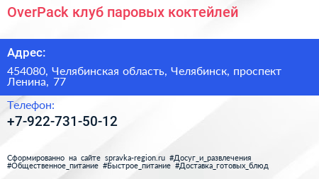 OverPack, клуб паровых коктейлей по адресу 454080, Челябинская область, Челябинск, проспект Ленина, 77 в дальнейшем Организация, размещена в следующих категориях: