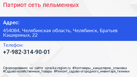 Патриот, сеть пельменных по адресу 454084, Челябинская область, Челябинск, Братьев Кашириных, 22 в дальнейшем Организация, размещена в следующих категориях:
