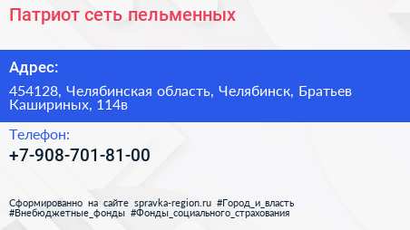 Патриот, сеть пельменных по адресу 454128, Челябинская область, Челябинск, Братьев Кашириных, 114в в дальнейшем Организация, размещена в следующих категориях: