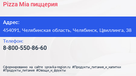 Pizza Mia, пиццерия по адресу 454091, Челябинская область, Челябинск, Цвиллинга, 38 в дальнейшем Организация, размещена в следующих категориях:
