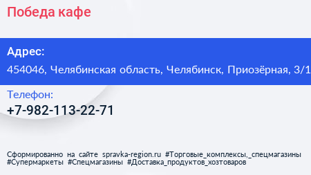 Победа, кафе по адресу 454046, Челябинская область, Челябинск, Приозёрная, 3/1 в дальнейшем Организация, размещена в следующих категориях: