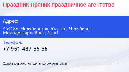 Праздник-Пряник, праздничное агентство по адресу 454136, Челябинская область, Челябинск, Молодогвардейцев, 31 к1 в дальнейшем Организация, размещена в следующих категориях:
