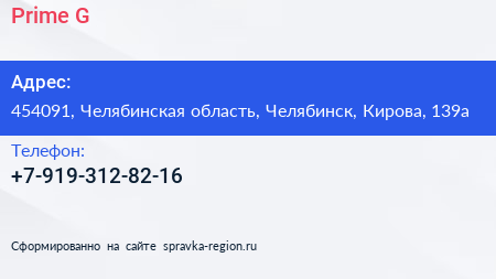 Prime G по адресу 454091, Челябинская область, Челябинск, Кирова, 139а в дальнейшем Организация, размещена в следующих категориях: