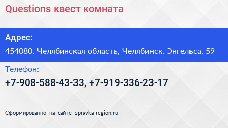 Questions, квест-комната по адресу 454080, Челябинская область, Челябинск, Энгельса, 59 в дальнейшем Организация, размещена в следующих категориях: