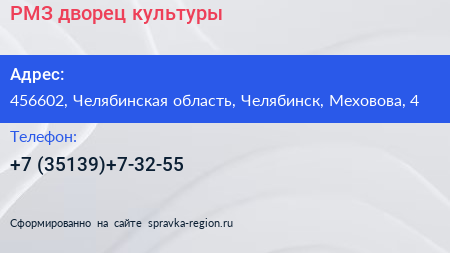РМЗ, дворец культуры по адресу 456602, Челябинская область, Челябинск, Меховова, 4 в дальнейшем Организация, размещена в следующих категориях: