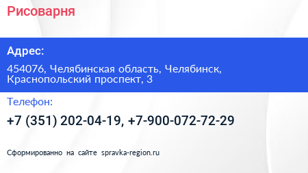 Для связи с организацией воспользуйтесь номером телефона: +7 (351) 202-04-19, +7-900-072-72-29. Ежедневно с 11:00 до 23:00, вы можете обратиться в эту организацию.