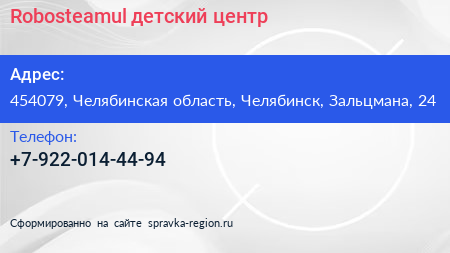 Robosteamul, детский центр по адресу 454079, Челябинская область, Челябинск, Зальцмана, 24 в дальнейшем Организация, размещена в следующих категориях: