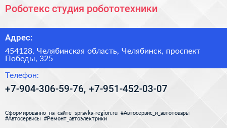 Роботекс, студия робототехники по адресу 454128, Челябинская область, Челябинск, проспект Победы, 325 в дальнейшем Организация, размещена в следующих категориях: