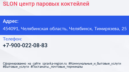 SLON, центр паровых коктейлей по адресу 454091, Челябинская область, Челябинск, Тимирязева, 25 в дальнейшем Организация, размещена в следующих категориях: