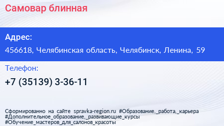 Самовар, блинная по адресу 456618, Челябинская область, Челябинск, Ленина, 59 в дальнейшем Организация, размещена в следующих категориях: