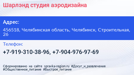 Шарлэнд, студия аэродизайна по адресу 456518, Челябинская область, Челябинск, Строительная, 26 в дальнейшем Организация, размещена в следующих категориях: