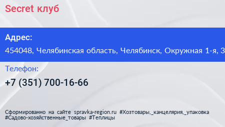 Secret, клуб по адресу 454048, Челябинская область, Челябинск, Окружная 1-я, 3 в дальнейшем Организация, размещена в следующих категориях: