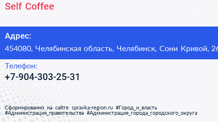 Self Coffee по адресу 454080, Челябинская область, Челябинск, Сони Кривой, 26 в дальнейшем Организация, размещена в следующих категориях: