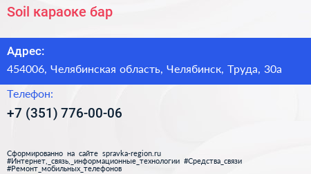 Soil, караоке-бар по адресу 454006, Челябинская область, Челябинск, Труда, 30а в дальнейшем Организация, размещена в следующих категориях: