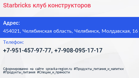 Starbricks, клуб конструкторов по адресу 454021, Челябинская область, Челябинск, Молдавская, 16 в дальнейшем Организация, размещена в следующих категориях: