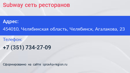 Subway, сеть ресторанов по адресу 454010, Челябинская область, Челябинск, Агалакова, 23 в дальнейшем Организация, размещена в следующих категориях: