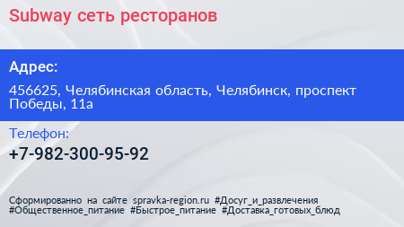 Subway, сеть ресторанов по адресу 456625, Челябинская область, Челябинск, проспект Победы, 11а в дальнейшем Организация, размещена в следующих категориях: