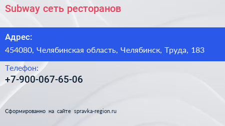 Subway, сеть ресторанов по адресу 454080, Челябинская область, Челябинск, Труда, 183 в дальнейшем Организация, размещена в следующих категориях:
