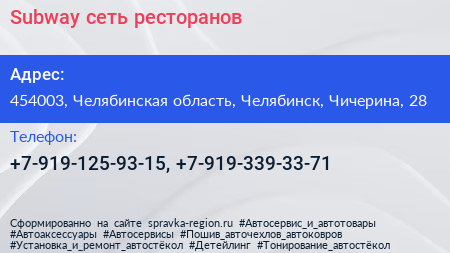 Subway, сеть ресторанов по адресу 454003, Челябинская область, Челябинск, Чичерина, 28 в дальнейшем Организация, размещена в следующих категориях: