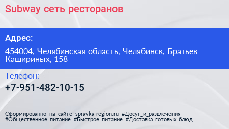 Subway, сеть ресторанов по адресу 454004, Челябинская область, Челябинск, Братьев Кашириных, 158 в дальнейшем Организация, размещена в следующих категориях:
