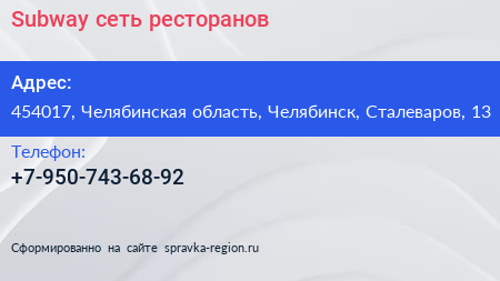 Subway, сеть ресторанов по адресу 454017, Челябинская область, Челябинск, Сталеваров, 13 в дальнейшем Организация, размещена в следующих категориях: