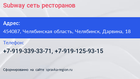Subway, сеть ресторанов по адресу 454087, Челябинская область, Челябинск, Дарвина, 18 в дальнейшем Организация, размещена в следующих категориях: