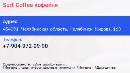 Surf Coffee, кофейня по адресу 454091, Челябинская область, Челябинск, Кирова, 163 в дальнейшем Организация, размещена в следующих категориях: