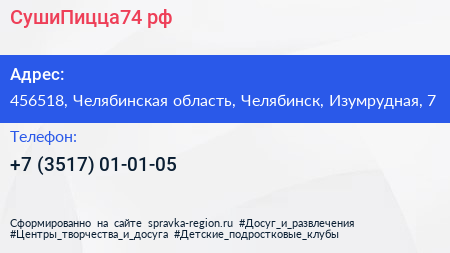 СушиПицца74.рф по адресу 456518, Челябинская область, Челябинск, Изумрудная, 7 в дальнейшем Организация, размещена в следующих категориях: