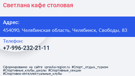 Светлана, кафе-столовая по адресу 454090, Челябинская область, Челябинск, Свободы, 83 в дальнейшем Организация, размещена в следующих категориях: