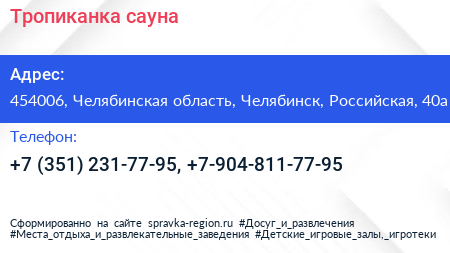 Тропиканка, сауна по адресу 454006, Челябинская область, Челябинск, Российская, 40а в дальнейшем Организация, размещена в следующих категориях:
