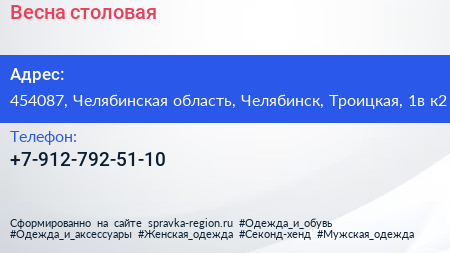 Весна, столовая по адресу 454087, Челябинская область, Челябинск, Троицкая, 1в к2 в дальнейшем Организация, размещена в следующих категориях: