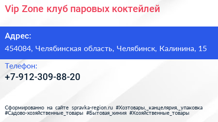 Vip Zone, клуб паровых коктейлей по адресу 454084, Челябинская область, Челябинск, Калинина, 15 в дальнейшем Организация, размещена в следующих категориях: