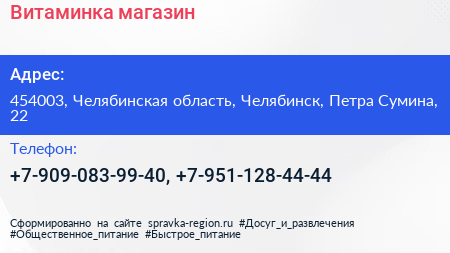 Витаминка, магазин по адресу 454003, Челябинская область, Челябинск, Петра Сумина, 22 в дальнейшем Организация, размещена в следующих категориях: