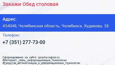 Закажи Обед, столовая по адресу 454048, Челябинская область, Челябинск, Худякова, 18 в дальнейшем Организация, размещена в следующих категориях: