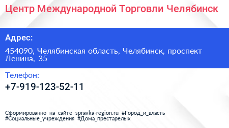 Центр Международной Торговли Челябинск по адресу 454090, Челябинская область, Челябинск, проспект Ленина, 35 в дальнейшем Организация, размещена в следующих категориях:
