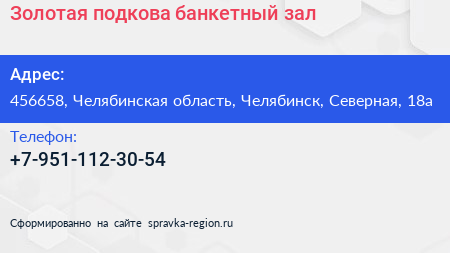 Золотая подкова, банкетный зал по адресу 456658, Челябинская область, Челябинск, Северная, 18а в дальнейшем Организация, размещена в следующих категориях: