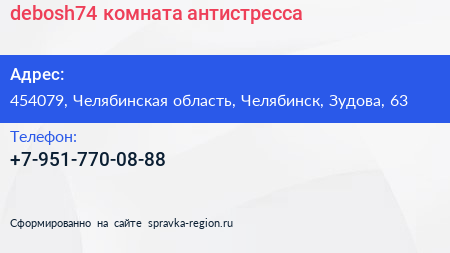 debosh74, комната антистресса по адресу 454079, Челябинская область, Челябинск, Зудова, 63 в дальнейшем Организация, размещена в следующих категориях: