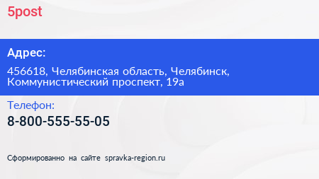 5post по адресу 456618, Челябинская область, Челябинск, Коммунистический проспект, 19а в дальнейшем Организация, размещена в следующих категориях: